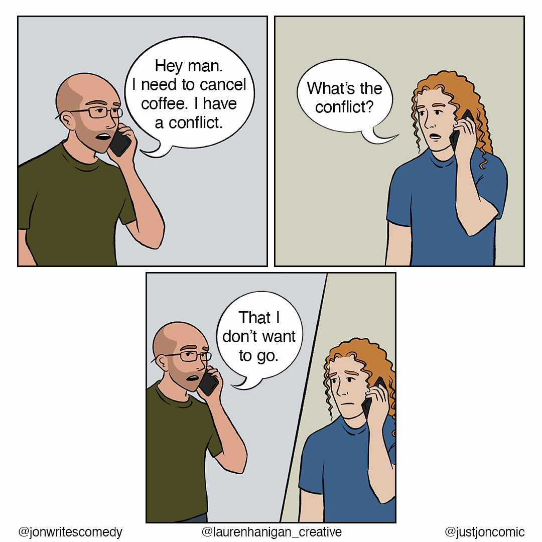 It was never going to happen, of course. I talk a big game but the chances of me leaving my house during the work day to meet up with someone are less than zero. You know the memes about people who cancel plans because they just don’t want to go somewhere? Hi. It’s me.